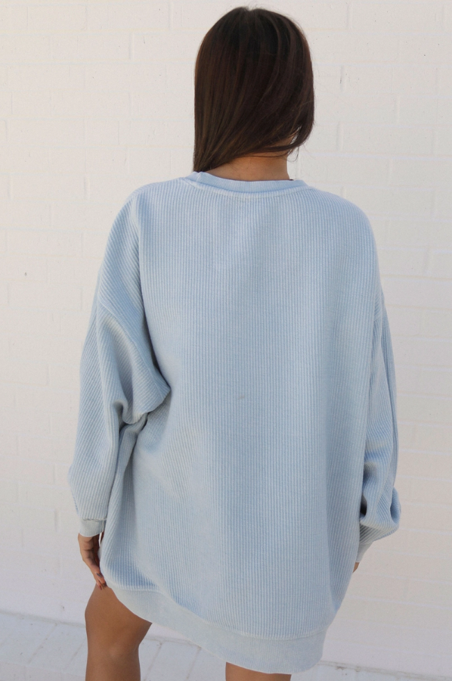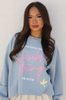 When you're meant to be, you're meant to be. This something blue corded crewneck sweatshirt features and oversized white, pink and yellow graphic complete with an "invisible string" and two turtle doves.