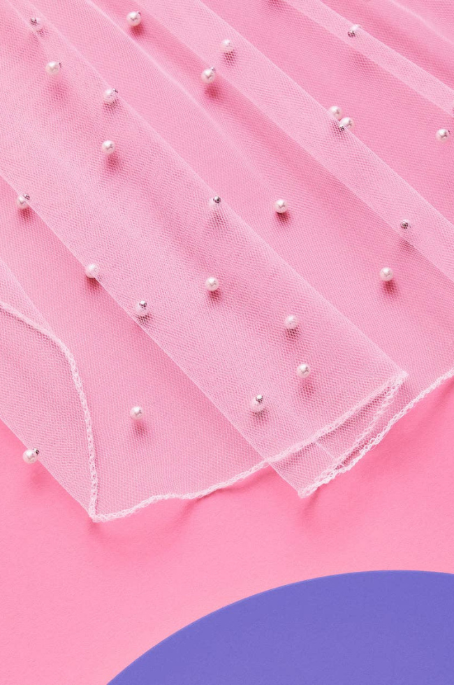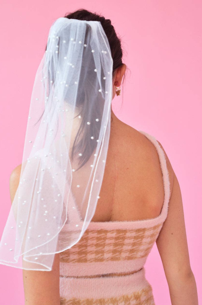 Pearls on a veil? Groundbreaking. Channel your inner Audrey Hepburn with this vintage inspired veil. Perfect for brunch, bridal showers and of course bachelorettes - she really does it all! Pearl dotted veil 22” from top to bottom.