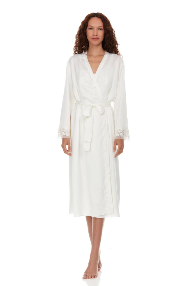 This silky-soft long robe features a lace trim on the cuff. The perfect robe for a bride to be.