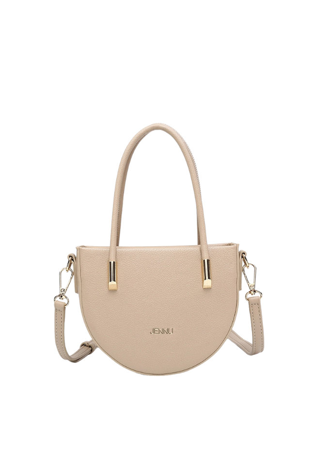 This Mini Crescent Purse features gold accents and is crafted from vegan leather. Perfect for both casual and formal occasions, this satchel is a must-have addition to your collection.