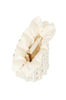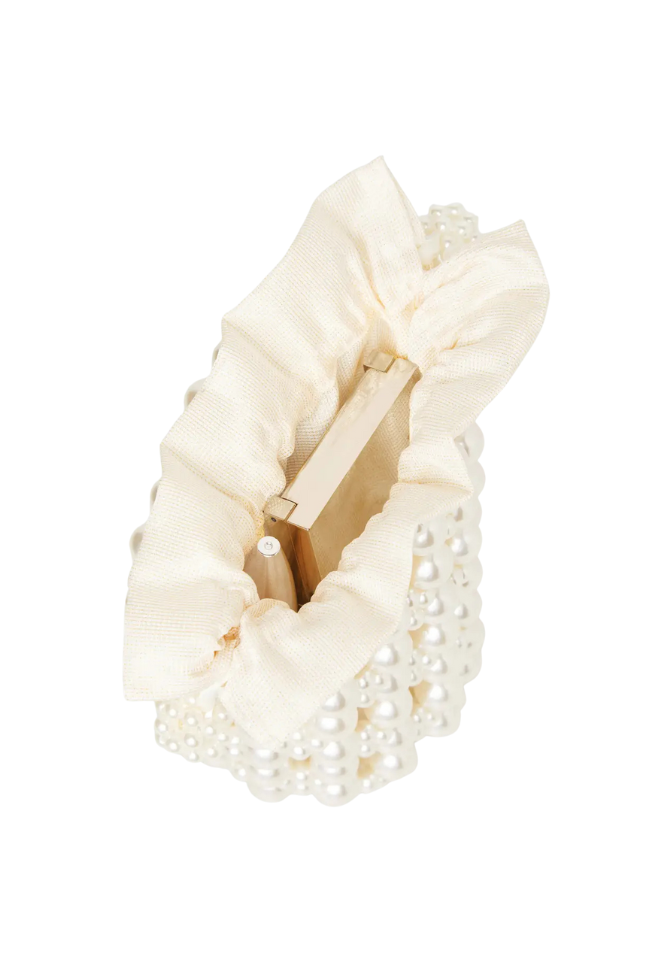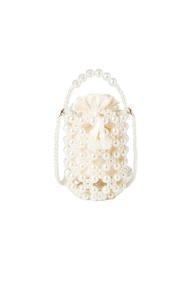 Adorned with a stunning array of lustrous pearls and intricate reticulated detailing, this handbag exudes elegance and refinement.