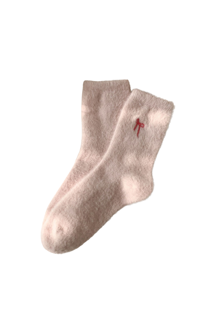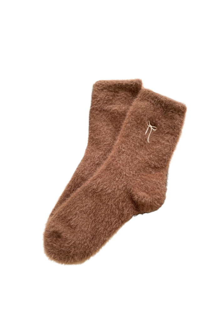 Fuzzy crew socks with embroidered bow detail. One Size.