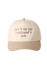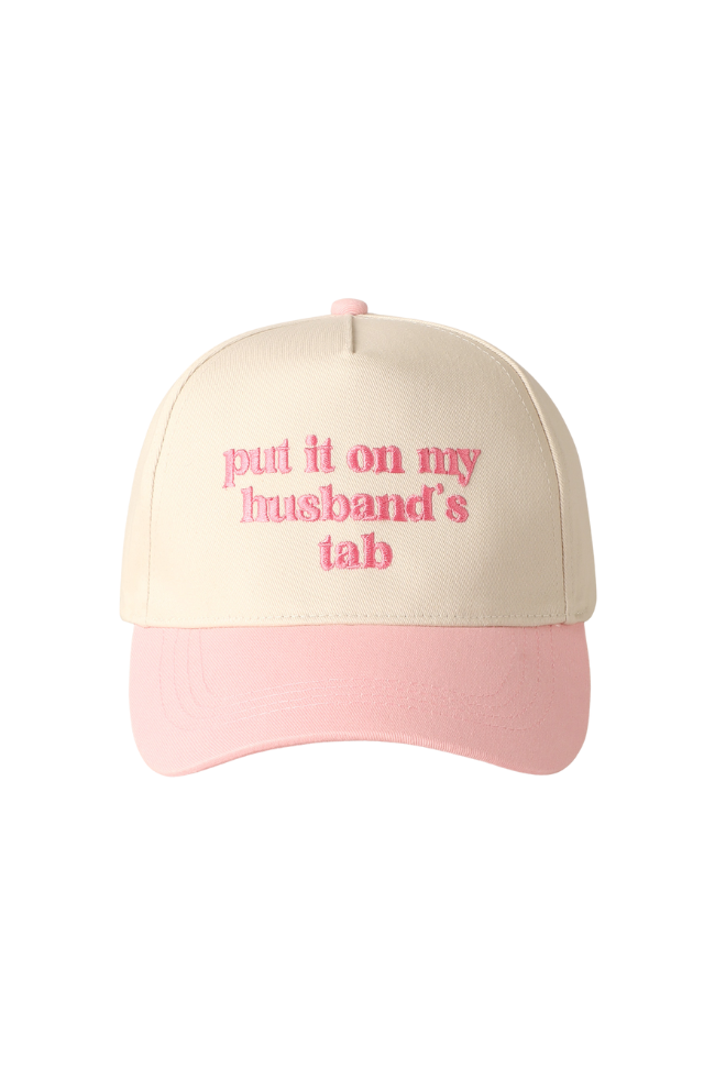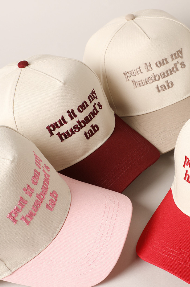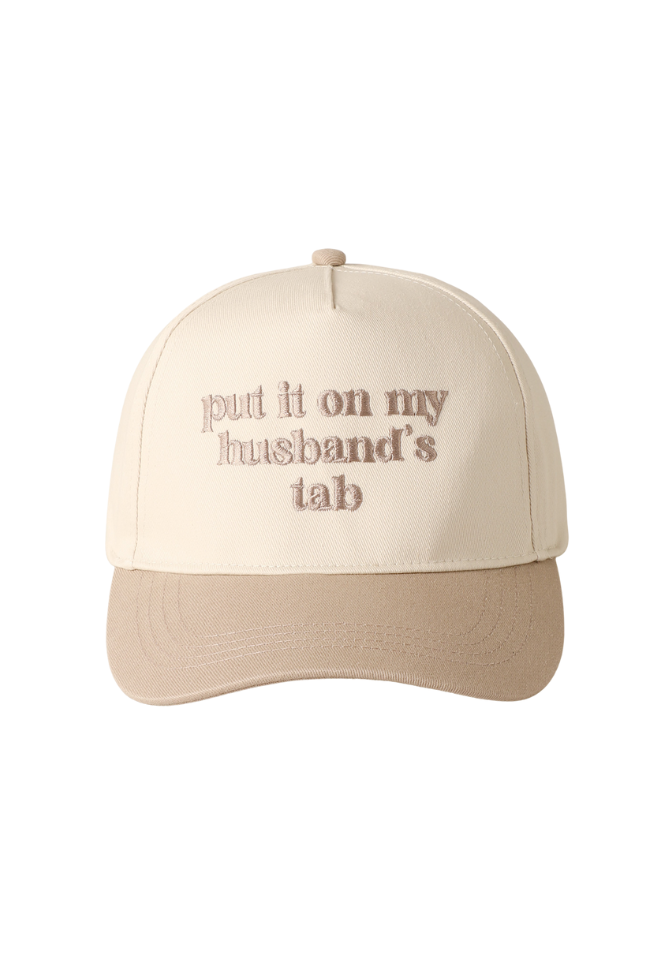 She's cute and she's funny- this baseball hat features "Put it on my husband's tab" embroidered on the front. Relaxed fit and adjustable buckle closure.