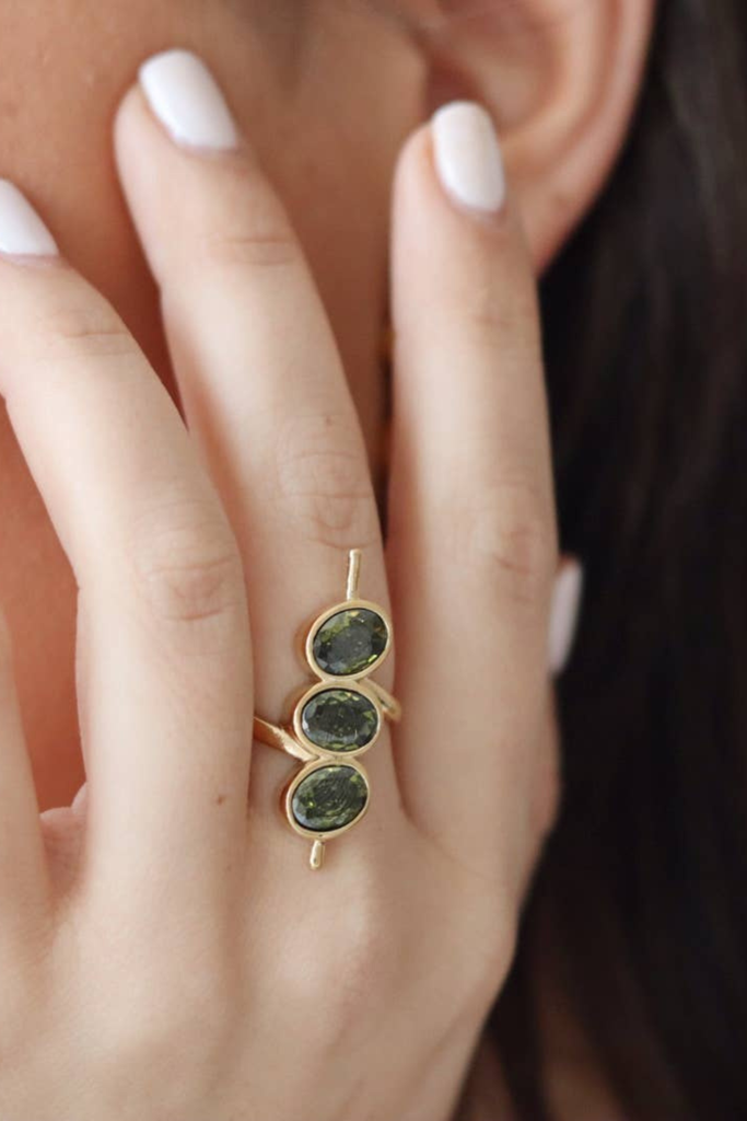 Elevate your style with our "Extra Olives" martini ring. This stunning piece features three sparkling olive zircon, a natural stone, adding a touch of playful elegance to your everyday look. Crafted with meticulous attention to detail, the ring is both comfortable and stylish.