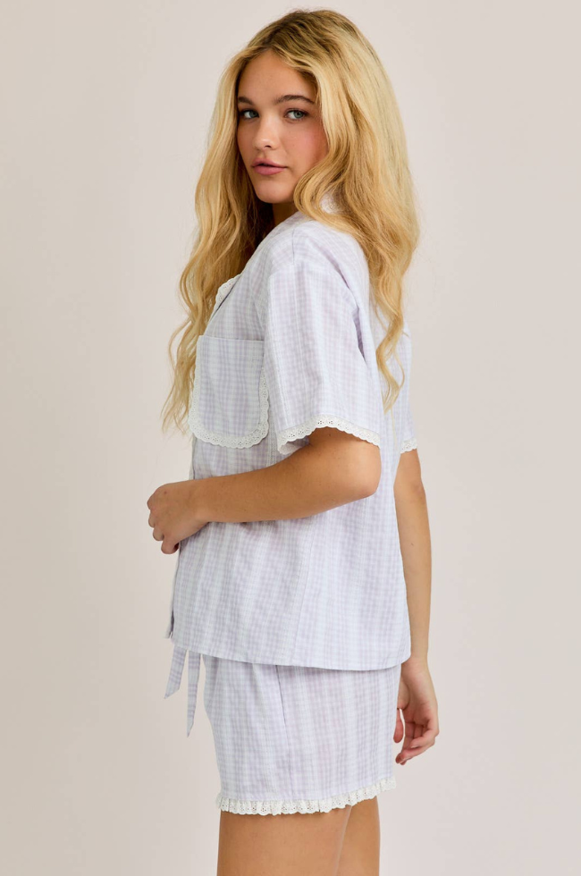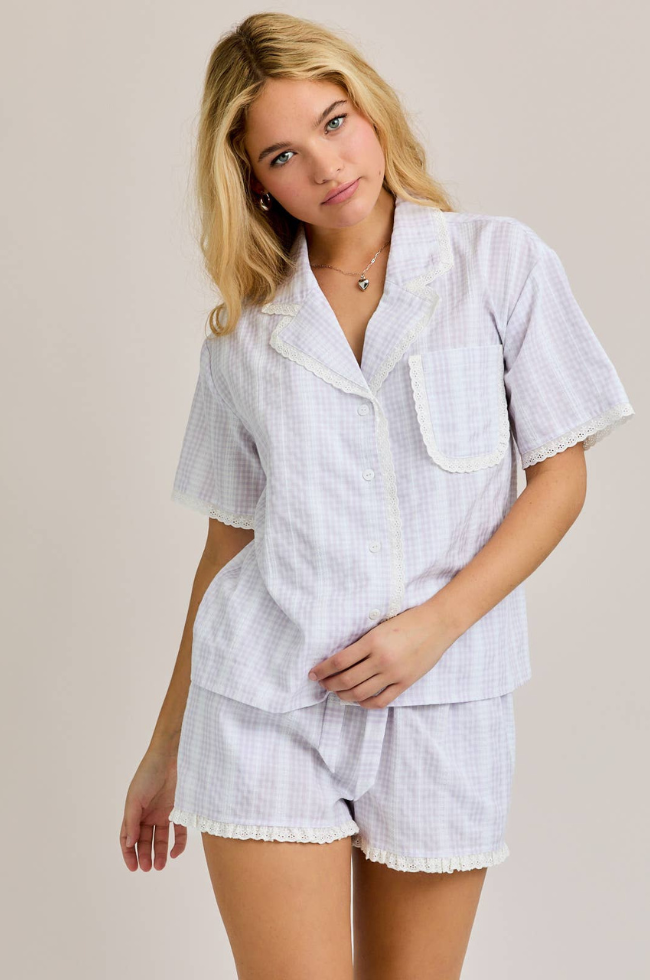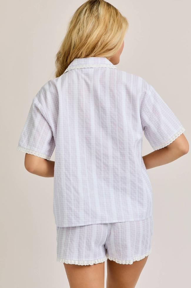 Add a little whimsy and elegance for your bridesmaids with this striped and eyelet lace two piece set. Button up top and drawstring shorts offer ease and comfort while still looking day of ready!