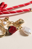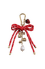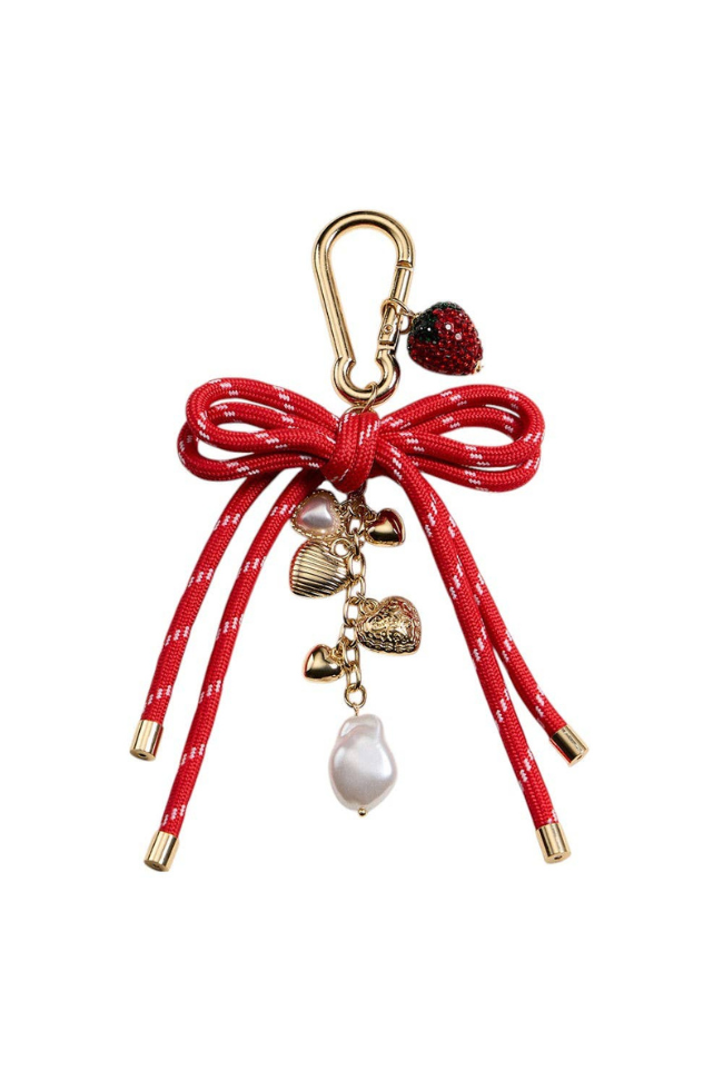 A darling bow heart adorned with charms a glitter strawberry charm, pearl drop, and heart accents. Perfect for adding a pop of color to a bag or keys.